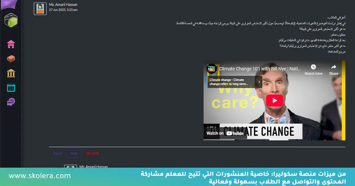 أن النظام يساعد المعلم بالتواصل مع الطلاب سواء بشكل منفرد أو جماعة. كما يوفر النظام خاصية وضع المنشورات، مما يسهم في تبادل الأفكار بينهما.
